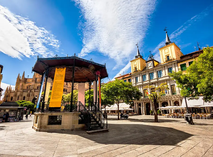Un espacio urbano que reúne las características de una típica plaza mayor y en el que se encuentran algunos monumentos como el ábside de la catedral, el Teatro Juan Bravo o la casa consistorial.